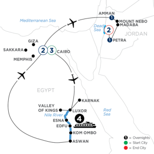 Your adventure continues with four nights in Jordan, with a flight from Cairo to Amman. Spend one night each in Amman and Petra, and two nights at the Dead Sea. Enjoy superior accommodations, transportation, and guided sightseeing with expert Local Guides to see the red city of Petra, Roman ruins of Amman, the ruins of Jerash, and the Dead Sea.